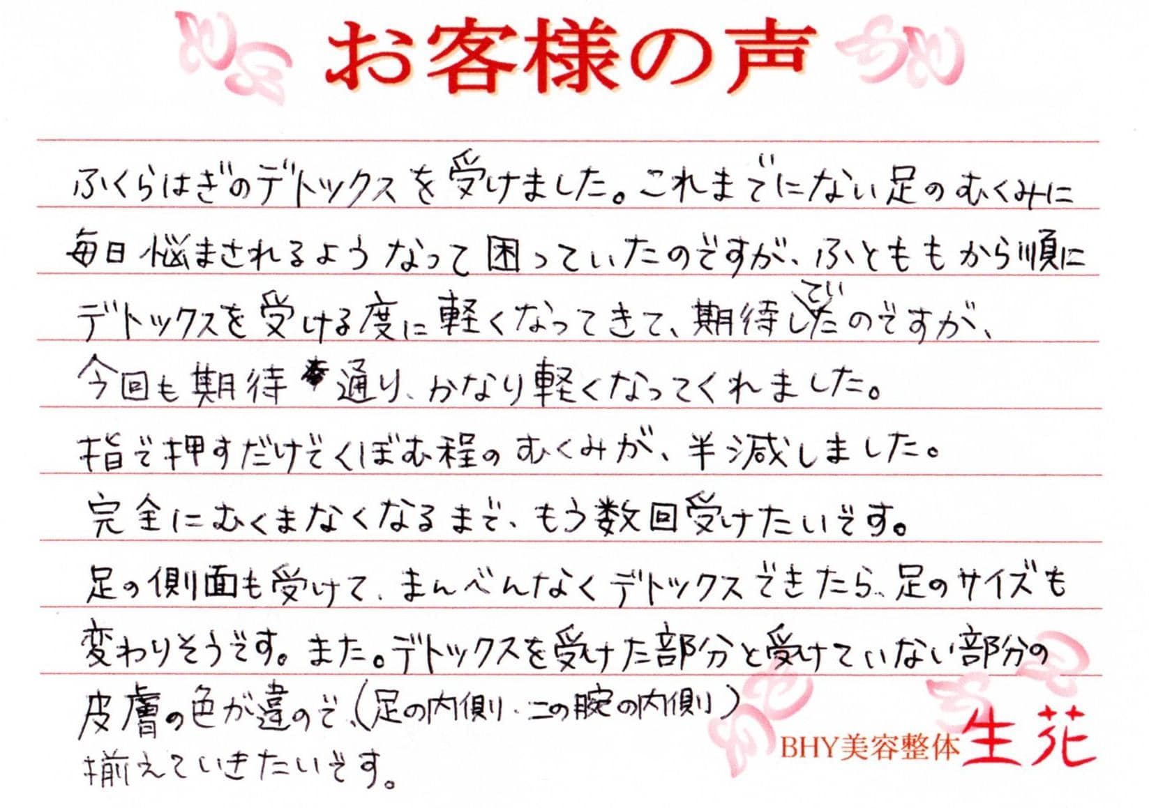 これまでにない足のむくみに毎日悩まされるようになって困っていたのですが、ふとももから順にデトックスを受ける度に軽くなってきて、期待していたのですが、今回も期待通り、かなり軽くなってくれました。